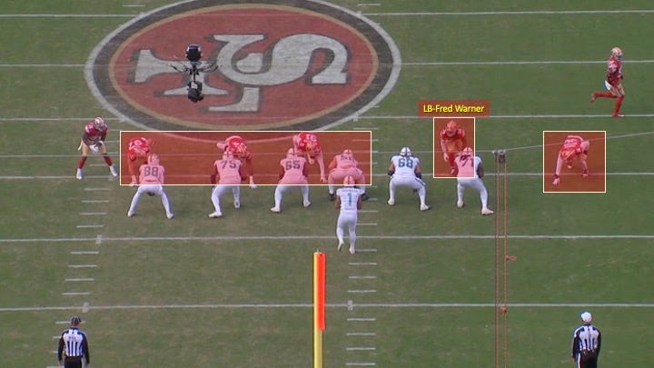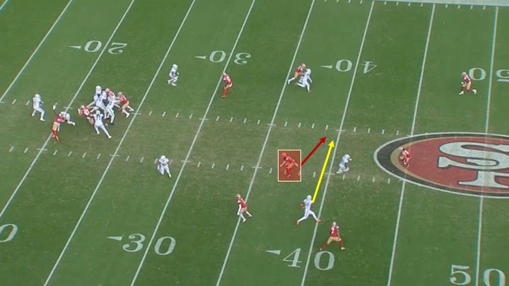 Focus on linebacker Fred Warner. He did a great job of reading and reacting to the route combo. As he saw Tyreek Hill fly by him down the seam, he immediately turned his attention to Sherfield, coming from the outside: