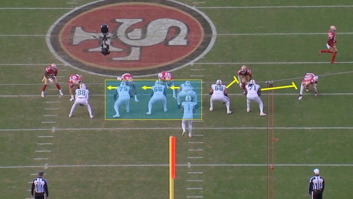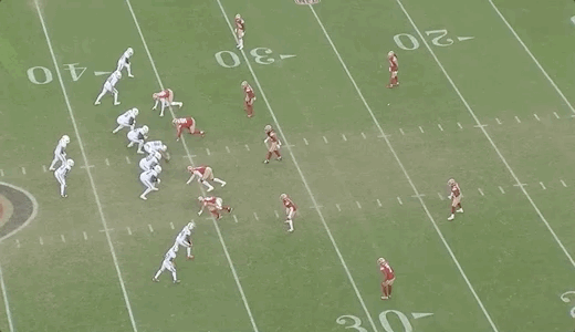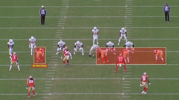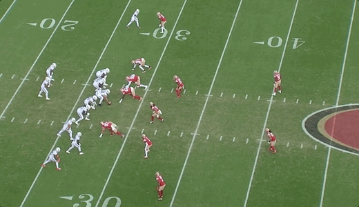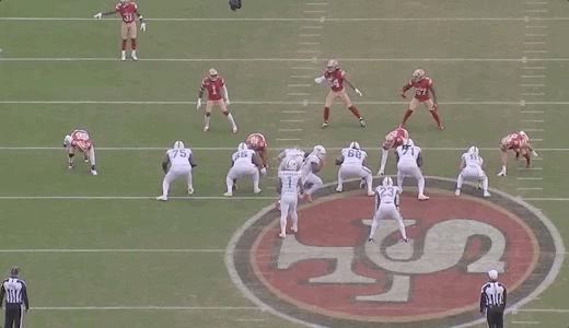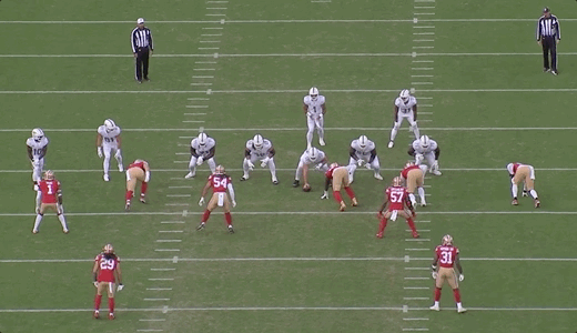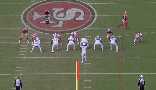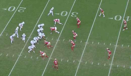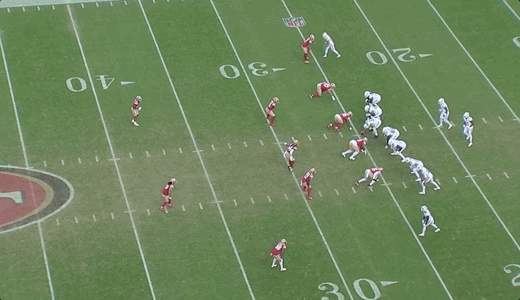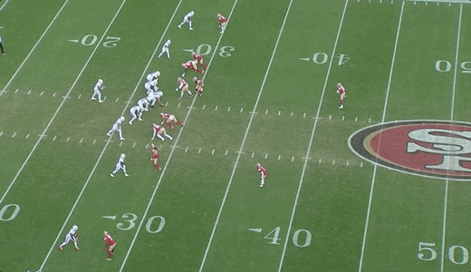 Let’s go back to that first 3rd down of the game shown above. This one seemed to set the tone for the afternoon. From the end zone angle, you can see that the 49ers were in their staple tilted front, with 3 down-linemen to one side of the center, and Nick Bosa to the other side: