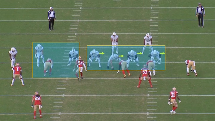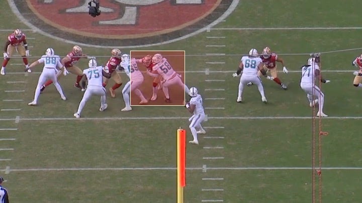 This time, the 49ers would run their stunt from the 3-man side since Miami didn’t have the extra man to account for it. The two interior linemen penetrated first and Bosa looped around inside: