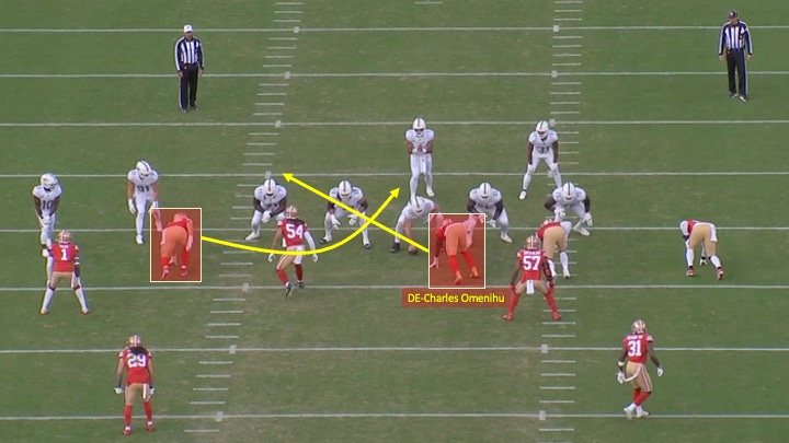 But the 49ers wouldn’t be running a stunt from the 3-man side. Instead, they would run it from Bosa’s side. Defensive end Charles Omenihu crossed the right guard’s face as the penetrator, taking him away from the middle, and Bosa looped around him inside (neutralizing the impact of the tight end’s pick):
