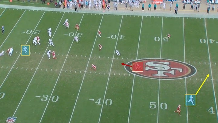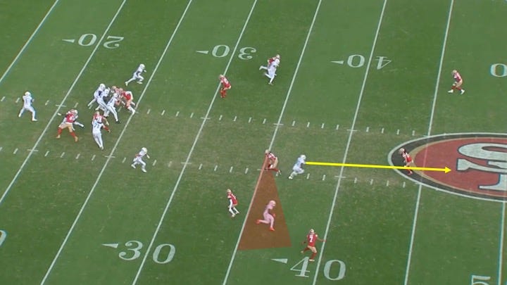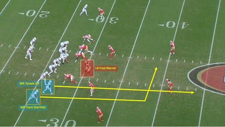 San Francisco’s ability to take away the middle was due to a combination of scheme and execution. This 3rd-and-6 on Miami’s second drive of the game is a great example. Note the route concept; a clearout route from Tyreek Hill with Sherfield running a deep-in route underneath him: