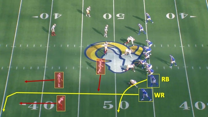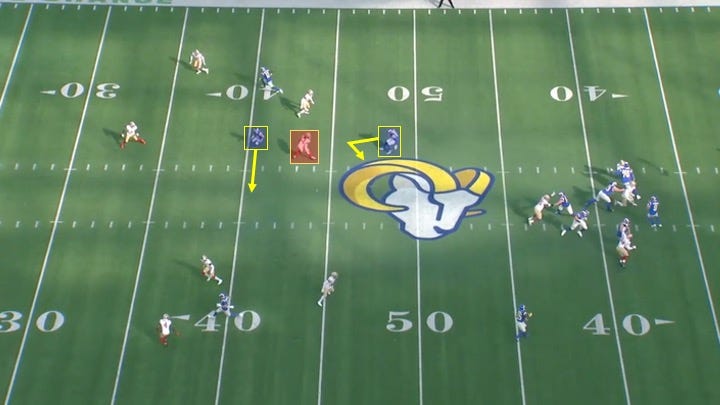 To the back side, the Rams had the X-receiver run his route with a vertical stem that split the cornerback and safety to his side, occupying both. The running back released to the flat, taking the linebacker to that side with him: