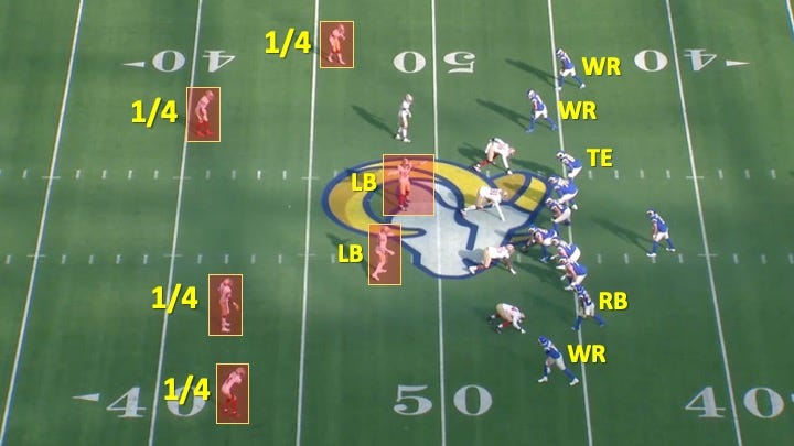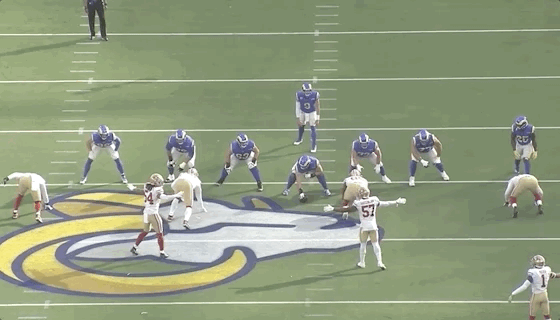 This was a 2nd down from Week 18 against the 49ers. San Francisco matched up to the Rams’ 11 personnel (1 RB, 1 TE, 3 WRs) with nickel personnel, leaving two linebackers on the field. They would end up playing quarters coverage, a common look out of their defense: