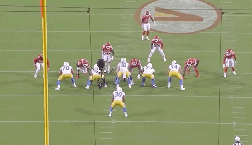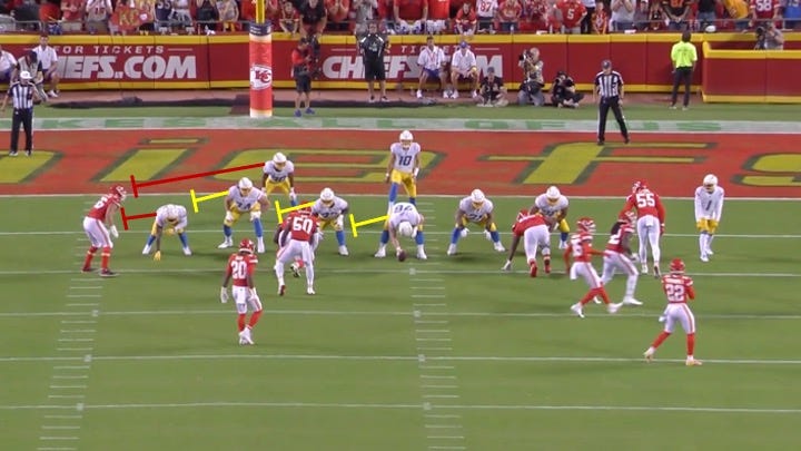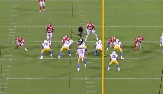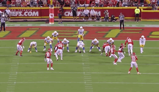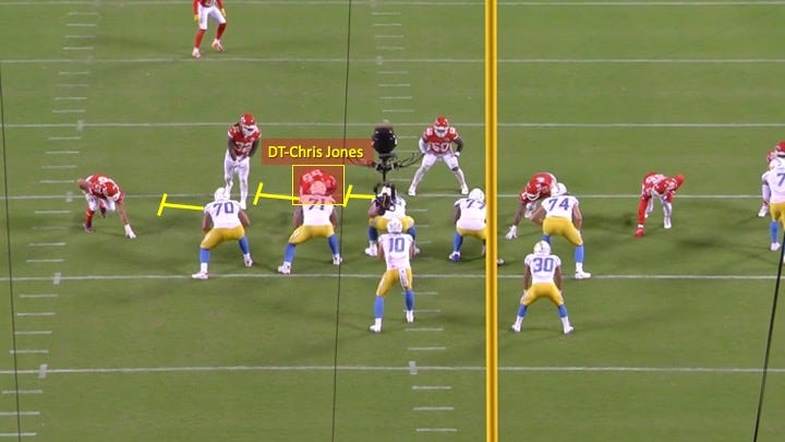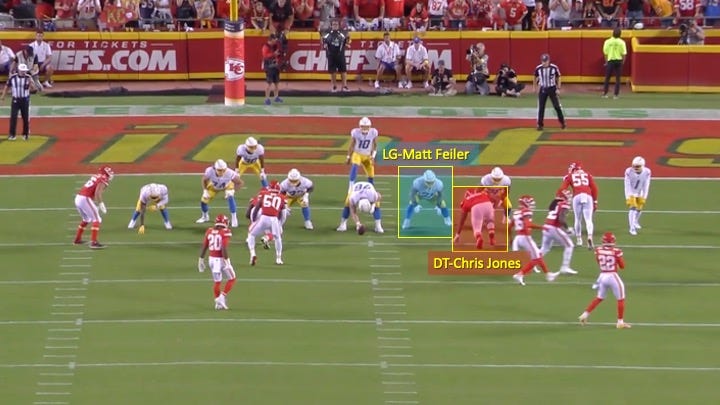 L.A.’s offense was not shut down by any means in this game. They racked up 401 yards and did score 24 points. Yes, the pick-6 obviously hurt, but the Chargers had multiple other opportunities to do something late in the game and failed because they lost the battle up front. They have to be able to more consistently win 1-on-1’s in the trenches like the ones shown above if they hope to overtake the Chiefs in the AFC West.