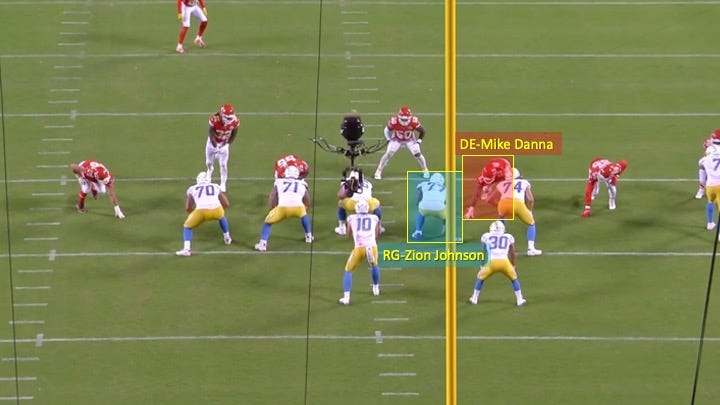 That resulted in 1-on-1’s to the right, with rookie right guard Zion Johnson responsible for defensive end Mike Danna: