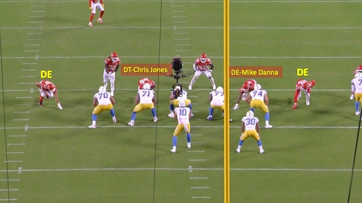On third down of their next drive, with the Chargers trailing by one score, disaster struck. First, notice the personnel package used by the Chiefs. They went with 3 defensive ends and Jones to get more speed in their pass rush: