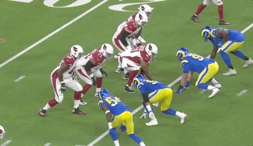 On this first play against the Buccaneers in the Divisional Round, for instance, Morris used alignment and late movement to get Von Miller (on the left) and Donald (on the right) matched up 1-on-1 inside against the left and right guards. This would end up being a 5-man rush with the nose occupying the center and the other 4 pass rushers all aligned outside of either tackle at the snap: