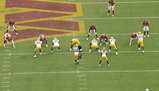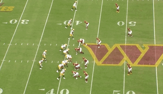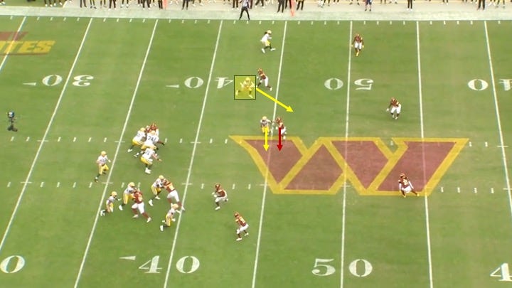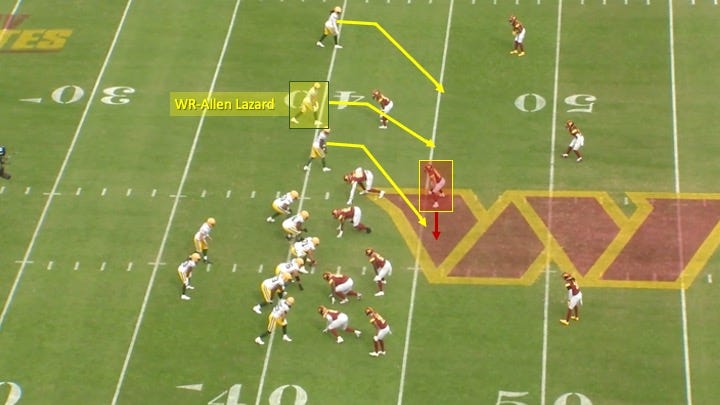 There are plenty of examples from the last few weeks. The below play was the first 3rd down of the game for the Packers against the Commanders in Week 7. Green Bay had triple slants called to Rodgers’ left. If that middle underneath defender went with the #3 inside receiver on the slant, Rodgers would deliver the ball to the #2 inside receiver, Allen Lazard. That’s exactly what happened: