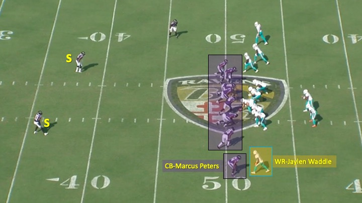 Pre-snap, the Ravens were showing 2-deep safeties, a blitz look, and Marcus Peters locking up in press-man on Waddle: