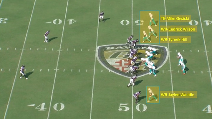 The Dolphins shifted to a 3x1 formation again, utilizing the motion to help prevent the Ravens from being able to effectively disguise their defense. This time, however, McDaniel spread out his three receivers to the strong side instead of using tight splits with a stack. And instead of using Waddle as the isolated receiver to the boundary, he used Tyreek Hill: