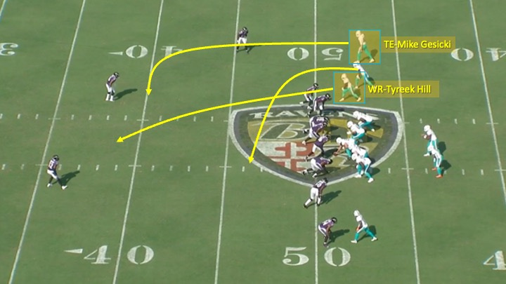 The routes to focus on are Tyreek Hill’s deep-over from the inside #3 position and Mike Gesicki’s in-breaker at the top of the screen: