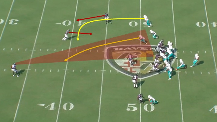 The Ravens responded as shown below, with the back-side safety turning his attention to Hill’s deep-over route: