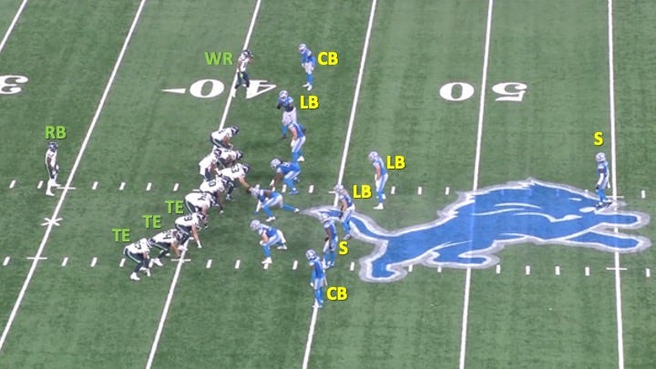 The Seahawks took a similar approach in Week 2 against the Lions, utilizing “13” personnel (1 RB, 3 TE) on 1st-and-10 to get Detroit to match up in base: