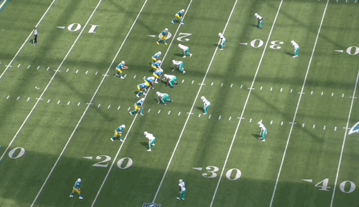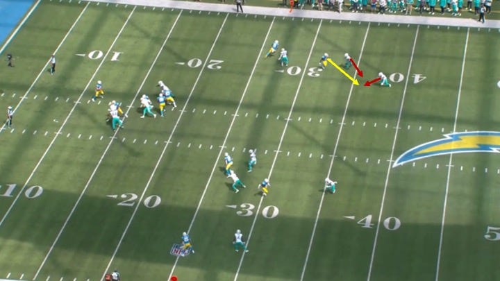 This was a 2nd-and-6, and the Chargers would come out in “12” personnel (1 RB, 2 TE). That got the Dolphins to match up in base personnel: