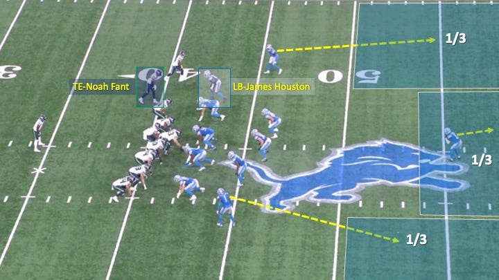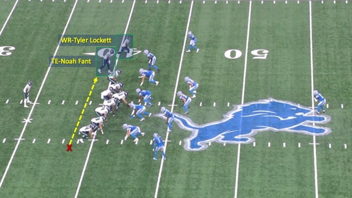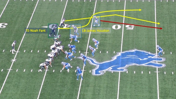 Seattle would motion tight end Noah Fant across the formation next to wide receiver Tyler Lockett. No one on the Lions followed: