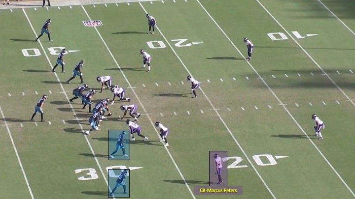 The Jaguars were in an empty formation, but let’s focus on the 2-receiver side to the boundary. That’s where cornerback Marcus Peters, who is notorious for taking chances and jumping routes, was aligned: