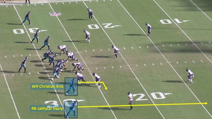 The Jaguars put wide receiver Christian Kirk in the slot and running back JaMycal Hasty on the perimeter. Kirk would run an out-route, and Hasty would run a go: