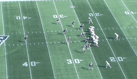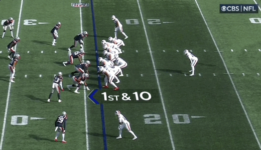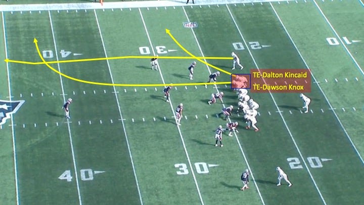 This time, Buffalo would run it on first down out of a different look. Here, it was a 3x1 formation with 2 in-line tight ends to the strong side and the #3 receiver running the sail instead of the #2: