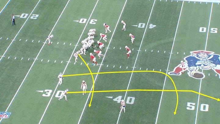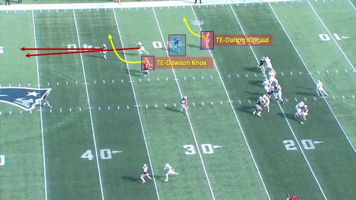 The play Belichick and Peppers were referring to was a “sail” 3-level stretch concept. During their first matchup of the 2022 season in Foxborough, the Bills utilized it off of play-action on their second offensive snap of the game, picking up 19 yards in the process: