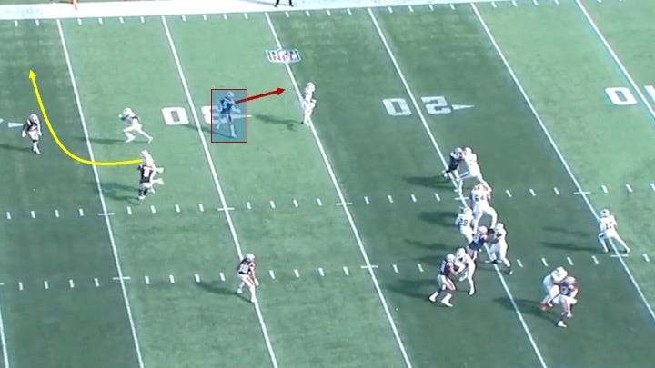 The #1 receiver knocked the top off the coverage, taking the cornerback with him downfield. That left Peppers as the conflicted defender tasked with covering both the sail route and the flat: