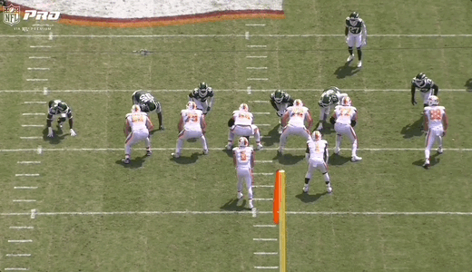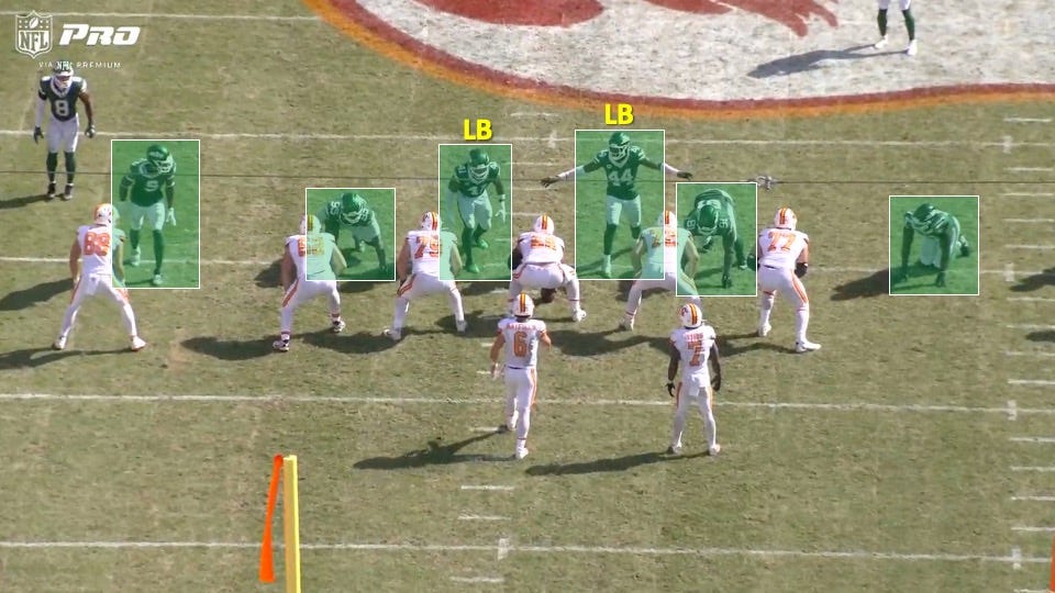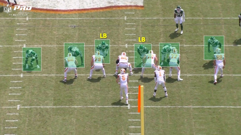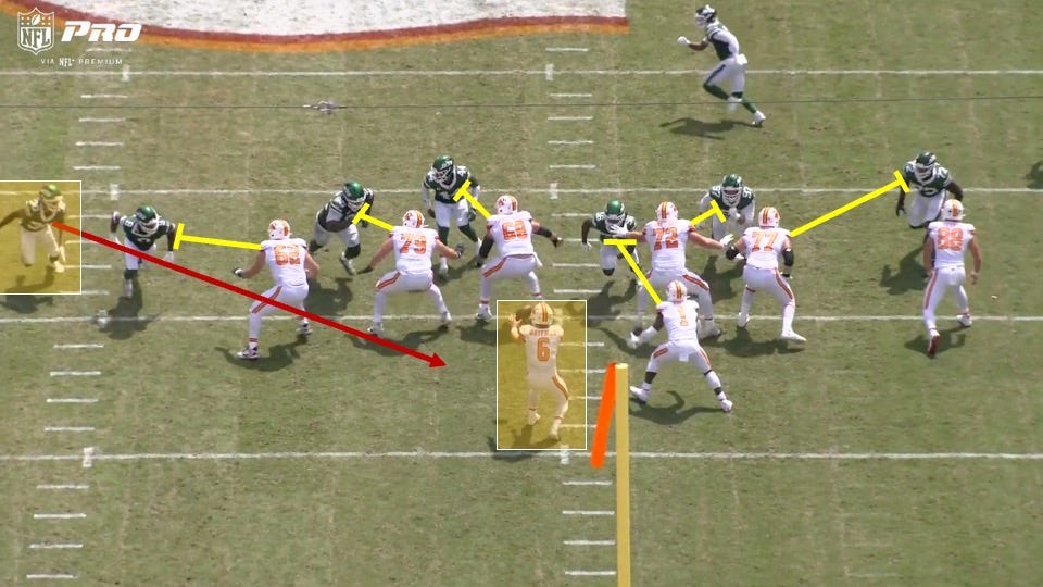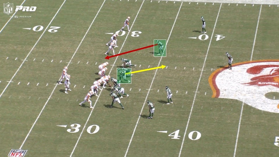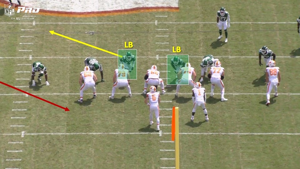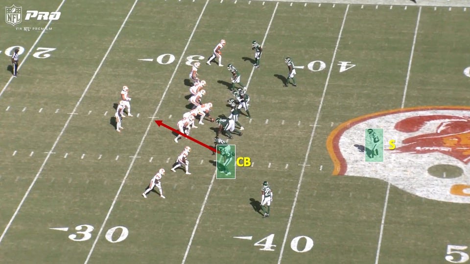 Notice the Jets’ defensive look. They had 6 men on the line of scrimmage, including two linebackers in the A-gaps. And they had a slot-corner over Tampa’s #2 inside receiver to the right. He was a potential blitz threat: