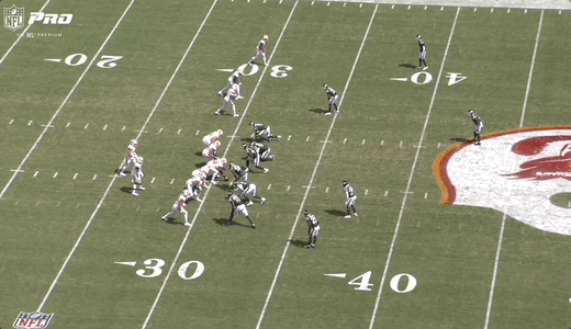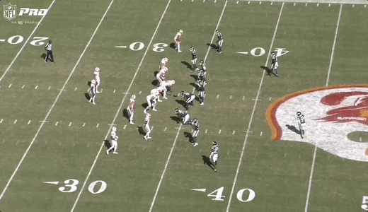 This was a 2nd-and-10 with just 1:36 remaining and Tampa trailing 27-26. The Buccaneers started in a 3x1 but shifted to a 2x2 well before the snap: