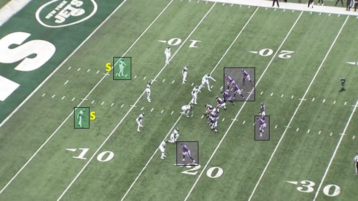 So the Ravens came out in a 3x1 bunch formation with the back offset to the weak side. Of course, the Jets responded with a 2-shell coverage look: