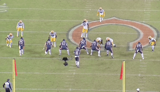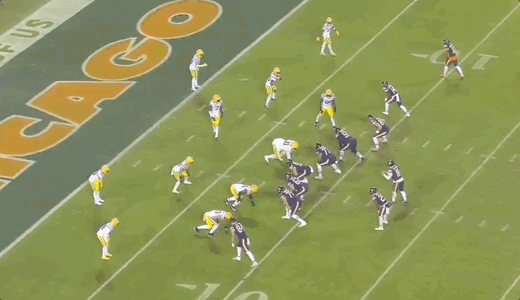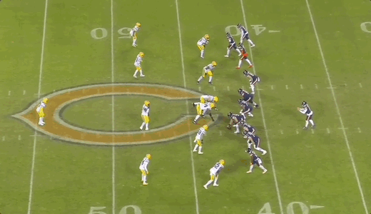 The Packers weren’t going to let Loveland beat them again. Watch the linebacker and safety to his side go with him at the snap: