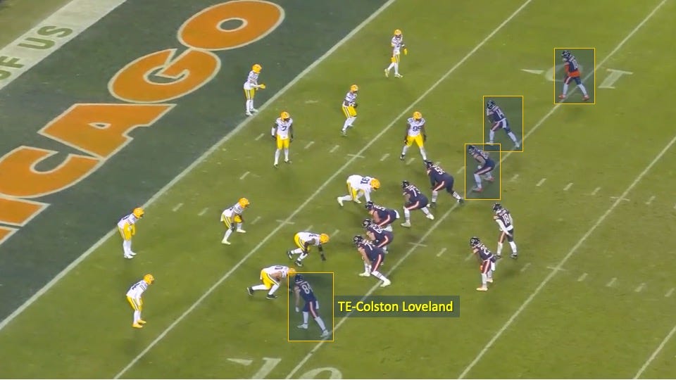 This was a 2nd-and-goal from the Packers’ 8-yard line. The Bears came out in a 1x3 formation with Loveland isolated to the backside: