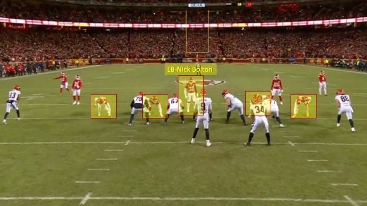 You could see it on Jones’ first sack. This was a 3rd-and-long. Spagnuolo spread out the defensive line with a 4-man front where both interior d-linemen were aligned outside of the guards. Then he had linebacker Nick Bolton walk down over the center: