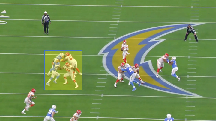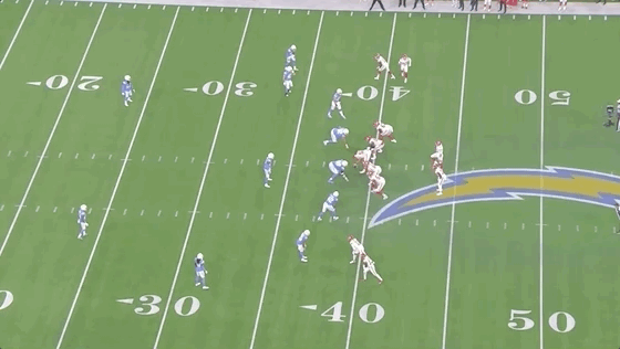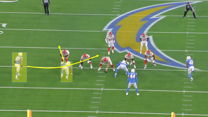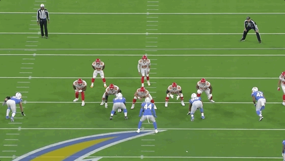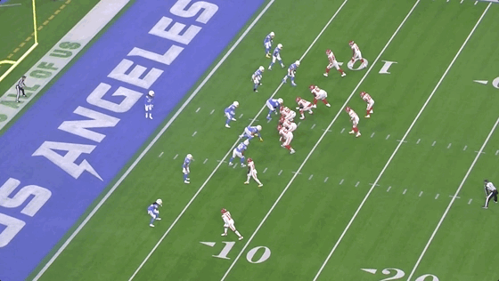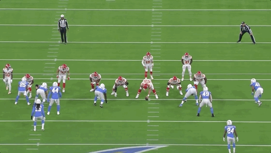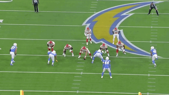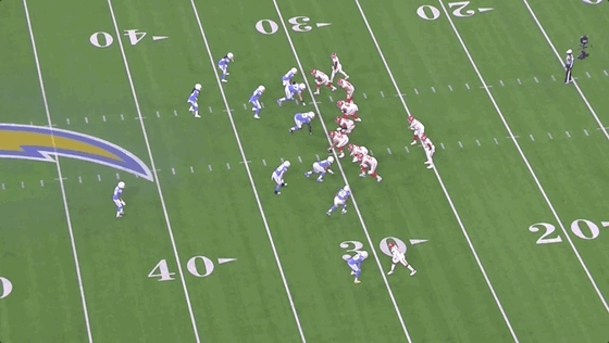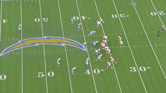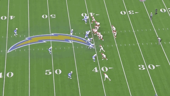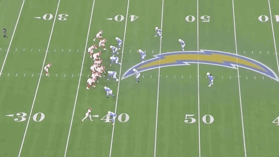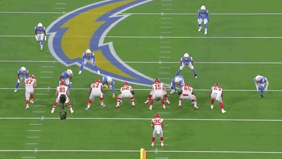 Mahomes’ 32-yard run two plays later came against zone coverage after Chargers defenders vacated their zones to hunt up the nearest possible receiving threats. Focus on the two highlighted players at the top of the screen:
