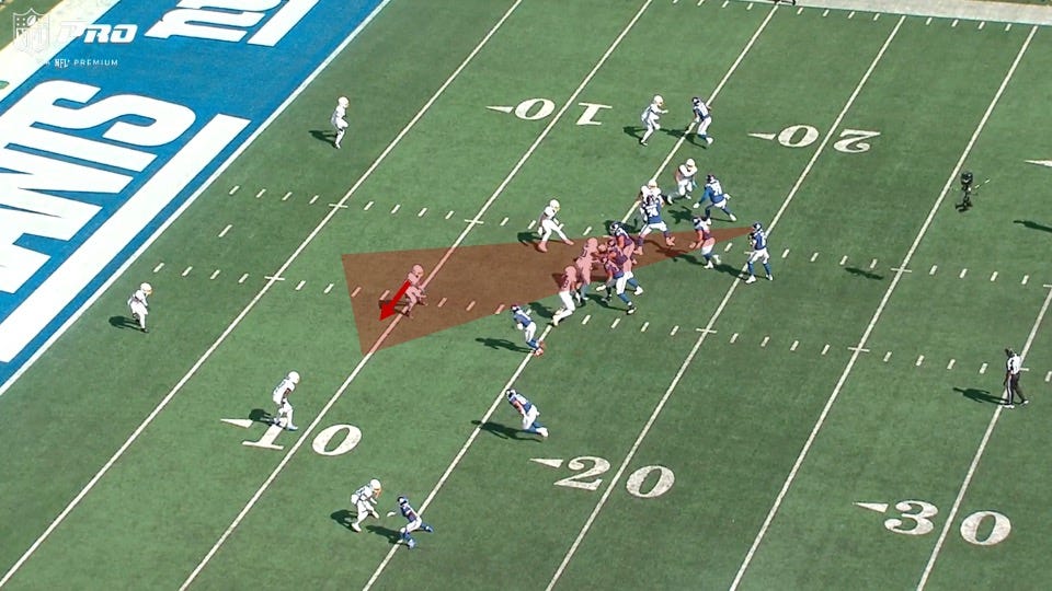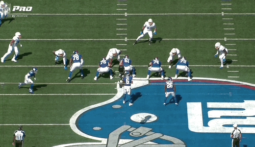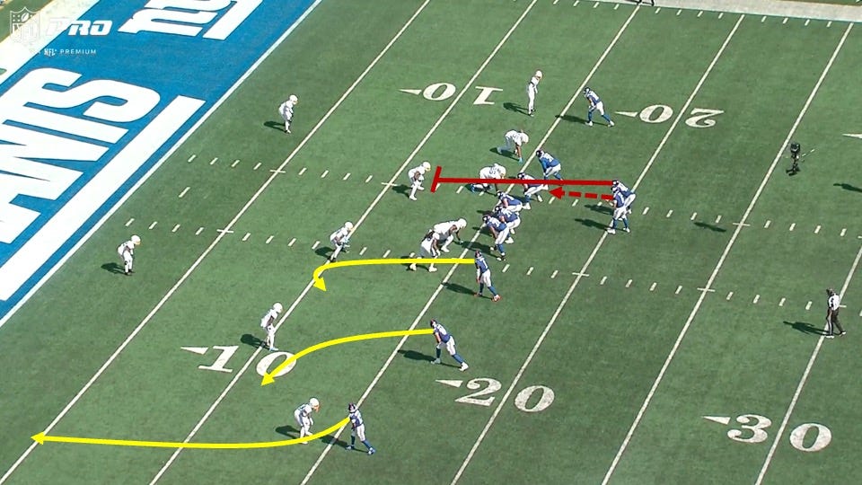 Later in the drive, Daboll dialed up a great play-call. This was a pass-run option. Dart had a stick concept to his left or the option to keep it and follow lead blocker Cam Skattebo up the middle: