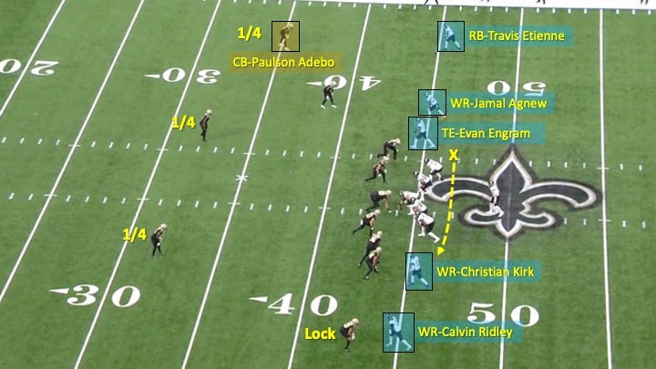 They came out in an empty formation and used two coverage indicators pre-snap. They motioned Christian Kirk across the formation, and they had running back Travis Etienne align on the perimeter. Since cornerback Paulson Adebo aligned over Etienne and no one followed Kirk’s motion, this appeared to be zone. Specifically, it looked like some kind of quarters coverage: