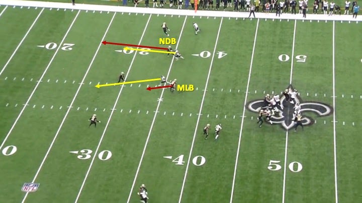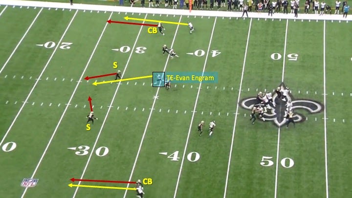 Underneath, the nickel DB ran with the #2 vertical since it was his responsibility to take him if he ran his route up or out. The mike linebacker carried Engram’s vertical inside, delivering him to the safety: