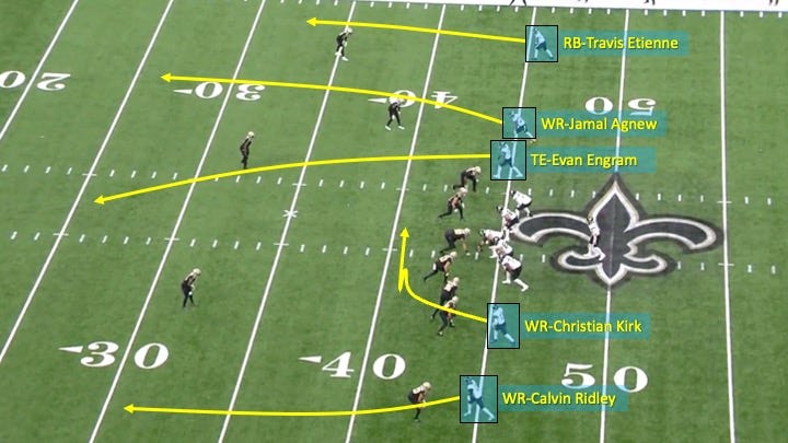The Jaguars attacked with a concept they like to use frequently - 4 verticals and Christian Kirk running an option route underneath from the slot: