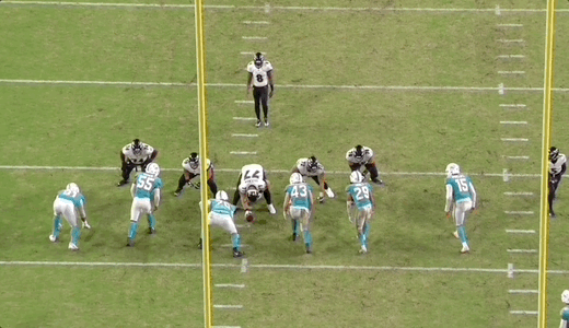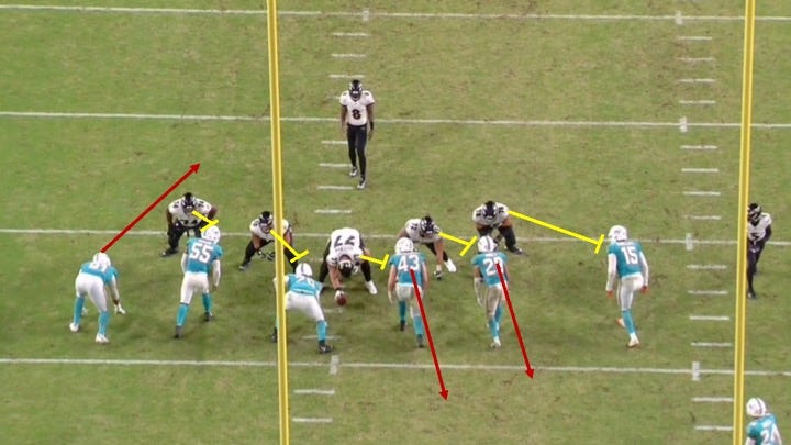 Below was a similar concept against the Ravens, just with the numbers 8-on-7 pre-snap instead of 6-on-5. The line slid left, the A and B-gap rushers to that side read it and dropped out, and the Dolphins still got a free rusher despite using a 6-man rush against 7 blockers: