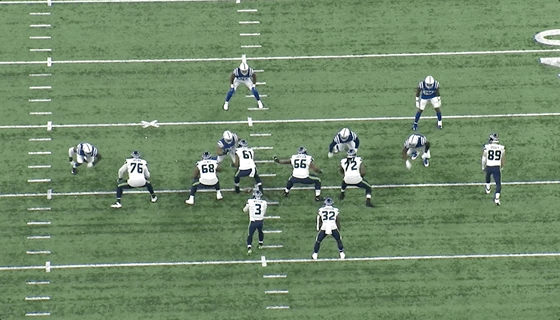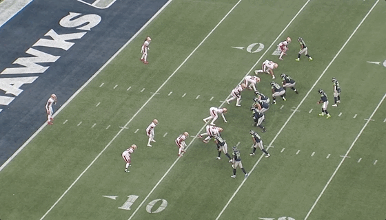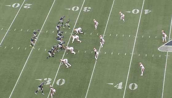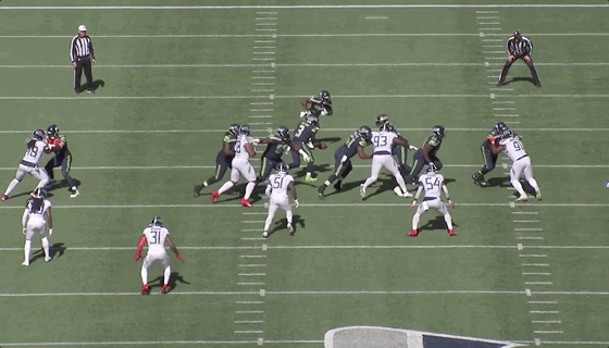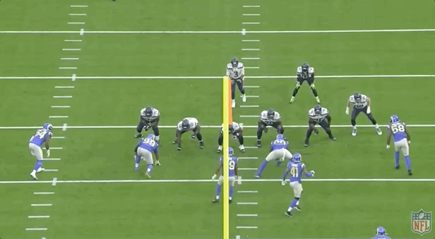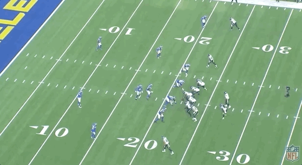 Wilson didn’t hit Dissly, though. As you can see above, he had slight pressure to his right. But this wasn’t disruptive pressure at all. Instead of climbing the pocket and calmly resetting his feet before hitting Dissly for an easy touchdown, he transitioned into play-maker mode and started to take off when he saw daylight in front of him: