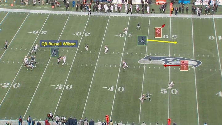 From that view, it appeared that Wilson avoided the pass rush and turned nothing into something. From the sideline All-22 angle, though, you can see that he missed a big play because he again instantly went into playmaker mode after feeling the initial pressure.