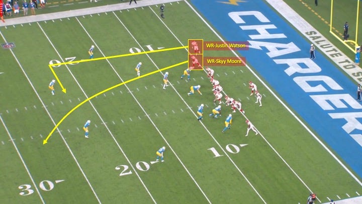 The Chiefs aligned in a 3x1 formation, had the #2 inside receiver (Skyy Moore) running an over/clear-out route, and the #1 receiver (Justin Watson) running a deep in: