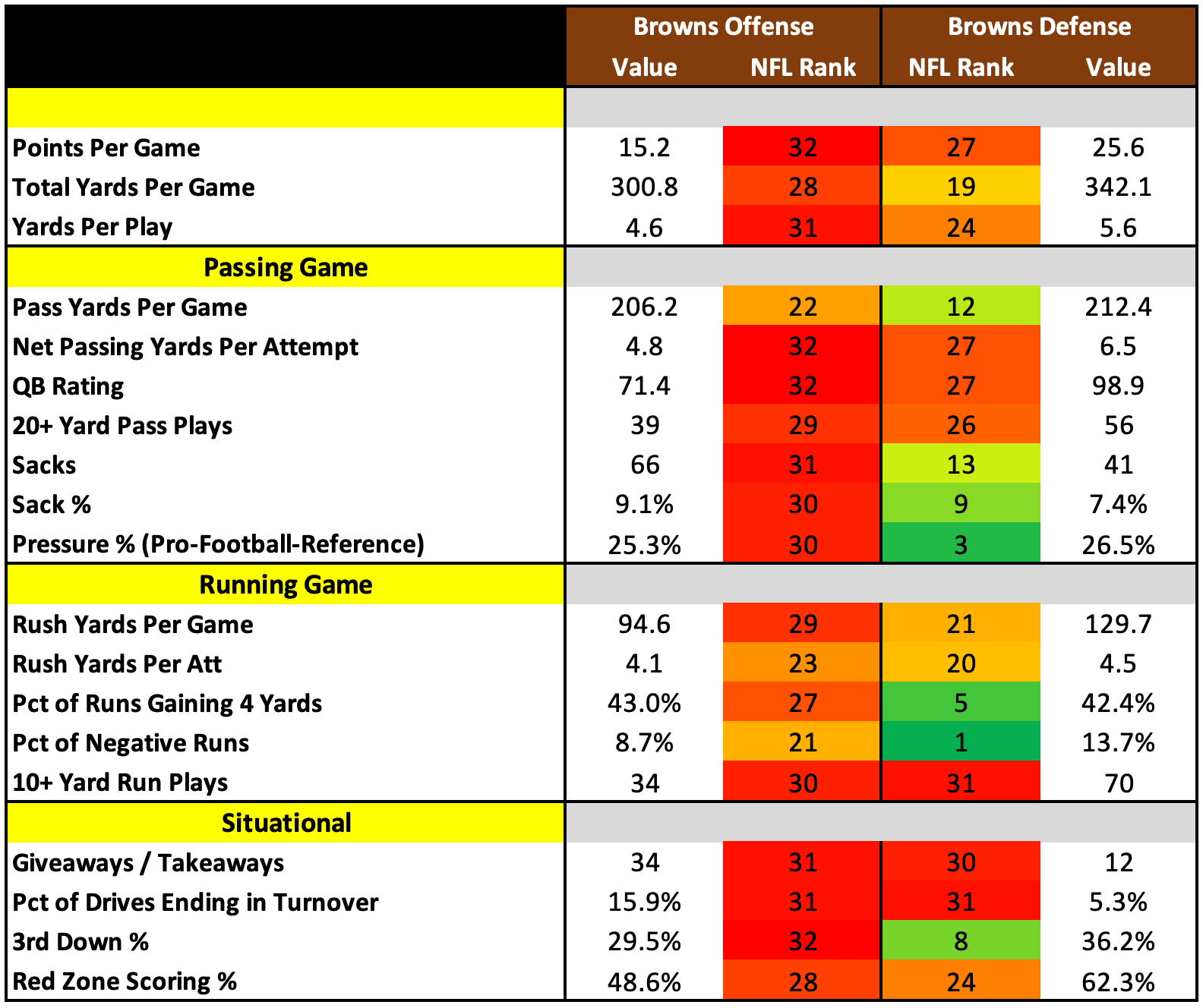 Injuries on the offensive line, particularly at the tackle positions, contributed to Cleveland finishing with the 3rd-worst pressure percentage allowed in the NFL.