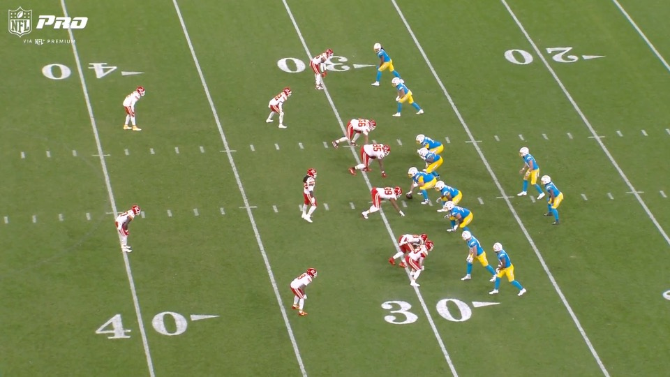 First notice the Chiefs’ alignment against L.A.’s shotgun 1-back set. There are no hints that a cover-0 blitz is coming here: