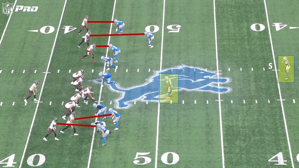 The Buccaneers offense used reduced splits on this play (receivers inside the numbers). But for an offense that aligns with receivers outside the numbers, the defenders matching up to them will generally play with inside leverage and use the sideline as their help: