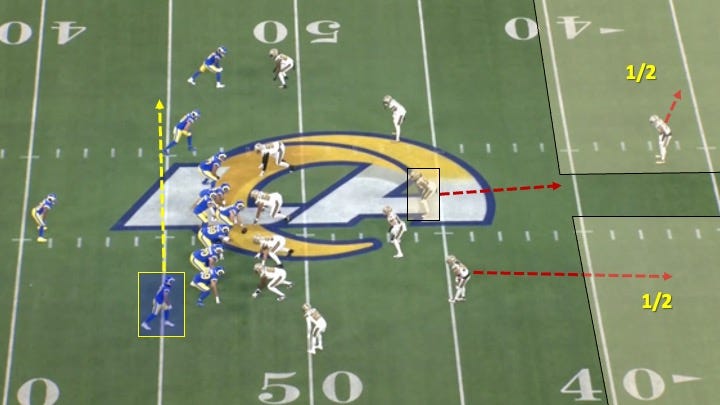 First, notice how the motion by Puka Nacua before the snap would get the Saints to spin out into Tampa-2: