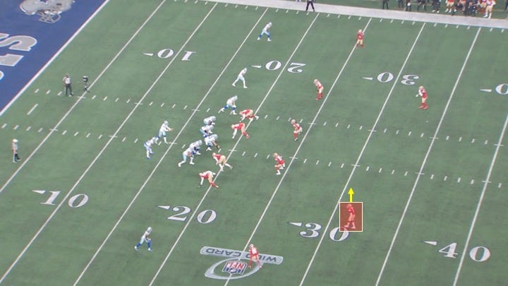 The only defender that could truly provide help to Thomas was the safety to Lamb’s side. However, he moved more to the middle of the field at the snap: