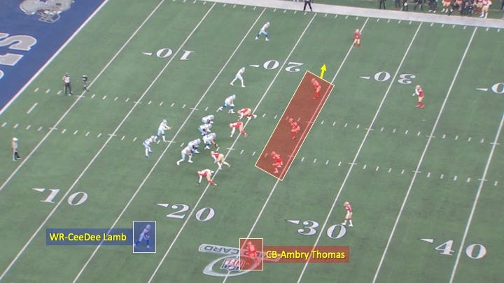 But I’m also not sure why Dak didn’t take the CeeDee Lamb vs. Ambry Thomas matchup to the other side of the field. First, the underneath coverage was skewed away from Lamb: