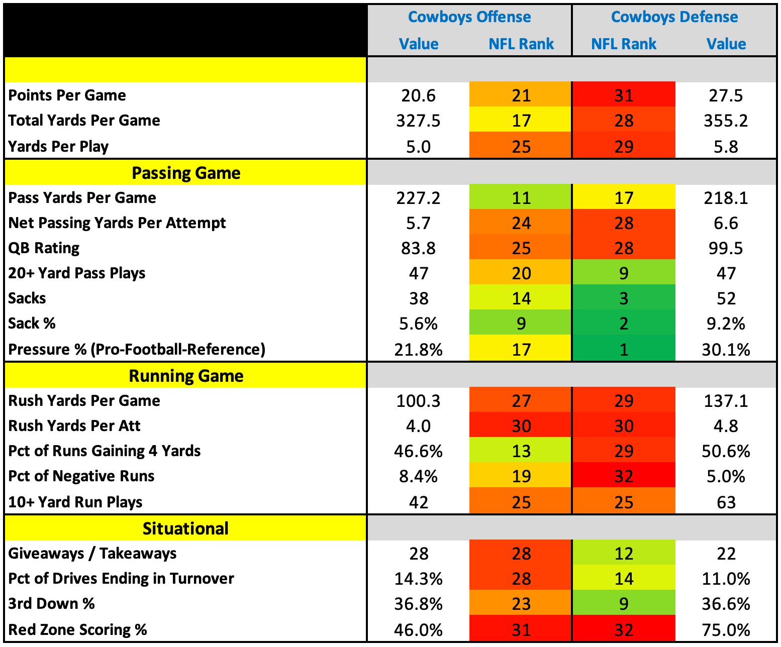 Maybe that also explains one of the weirdest defensive seasons in recent memory. Dallas had arguably the best pass rush in the NFL, finishing 1st in pressure percentage and 3rd in sacks. A great pass rush generally drives overall defensive effectiveness. With this team, it did not.