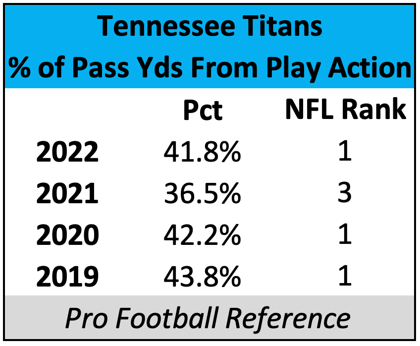 Aside from addressing an obvious need on their roster, the biggest reason that this is a good fit is Tennessee’s use of play-action. No team had a greater percentage of its passing yards come from play-action than the Titans did in 2022. In fact, that’s pretty much been the case since Ryan Tannehill got to Tennessee in 2019: