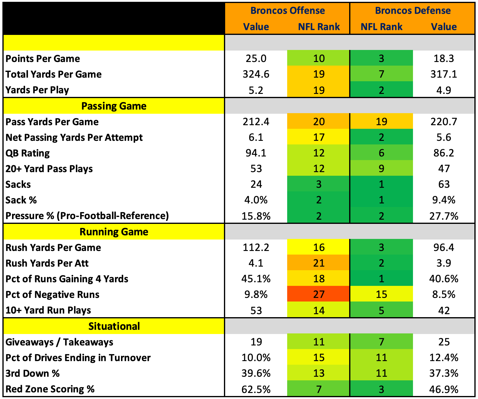 The defense was simply outstanding last year under defensive coordinator Vance Joseph. They won primarily on the strength of their pass rush, which finished 2nd in the NFL in pressure % and first in sacks.