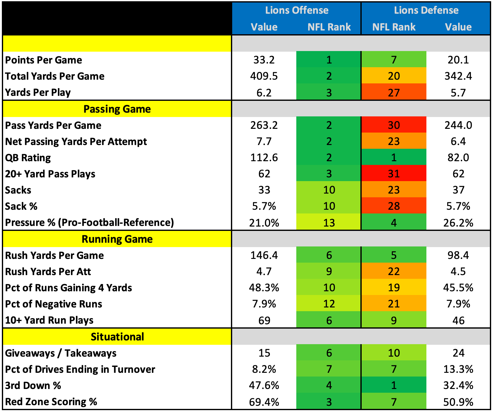 We’ll start with the offense, which finished #1 in scoring and #2 in total yards. Great scheme and play-calling were at the center of their success. Detroit was one of the most balanced teams in the league, throwing the ball 52.2% of the time and running it the other 47.8%.