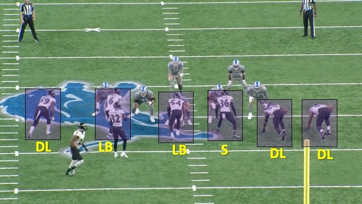 Here was another example from the 2021 season against the Lions. This time, the offense was in a 6-man protection, and the Ravens were showing 6 men on the line of scrimmage (with lots of movement behind them):